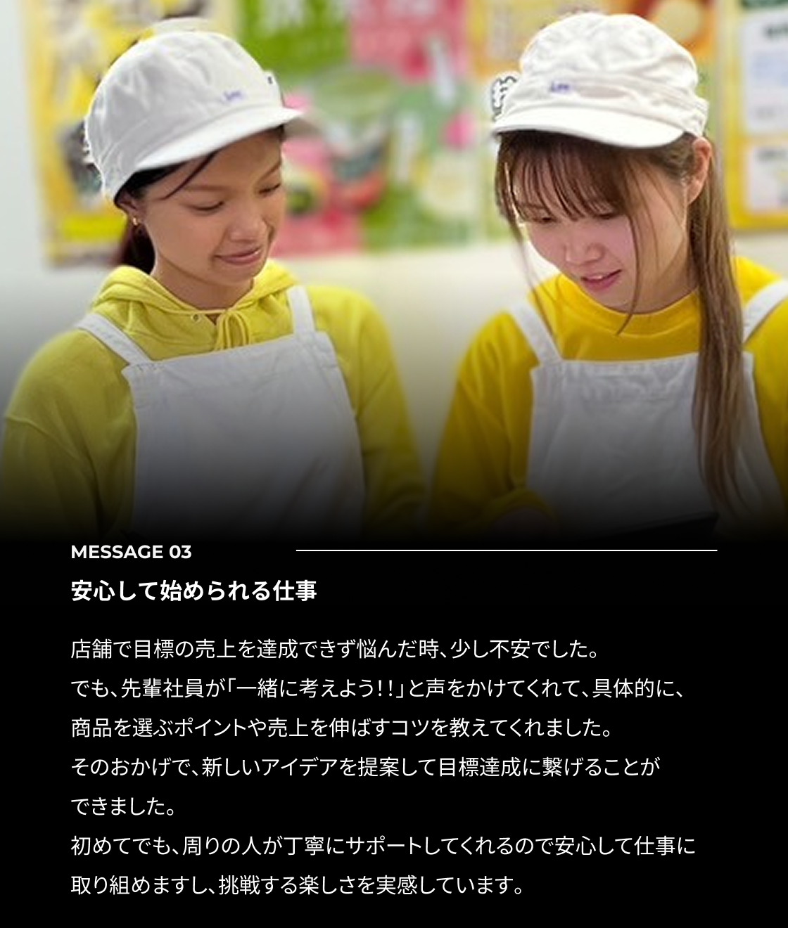 先輩が丁寧に教えてくれたおかげで今では楽しく働けています。