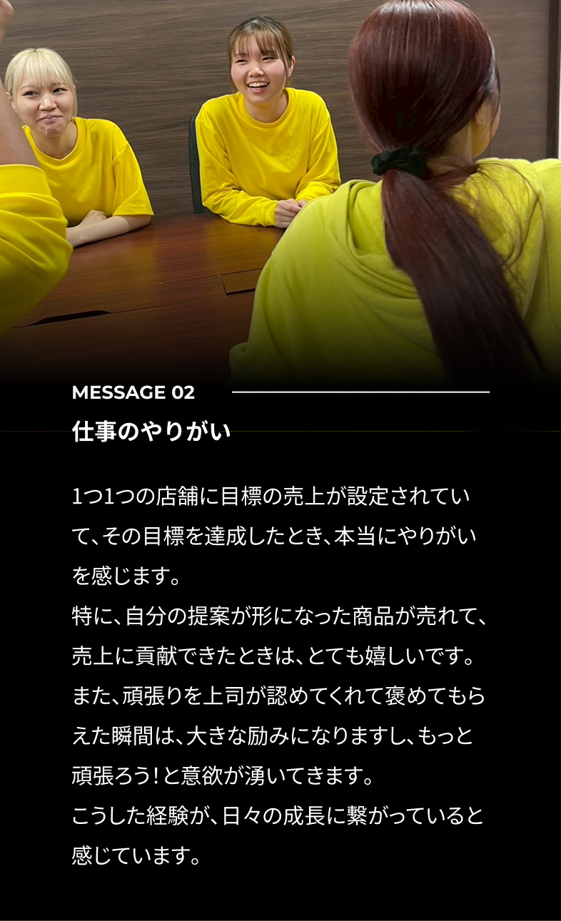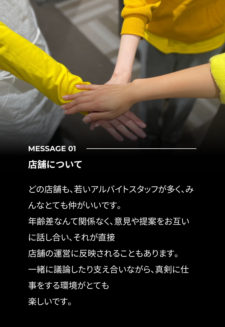 A:新店舗出店時などは忙しい時期もありますが、チームで協力し合いながら働く楽しさがあります。